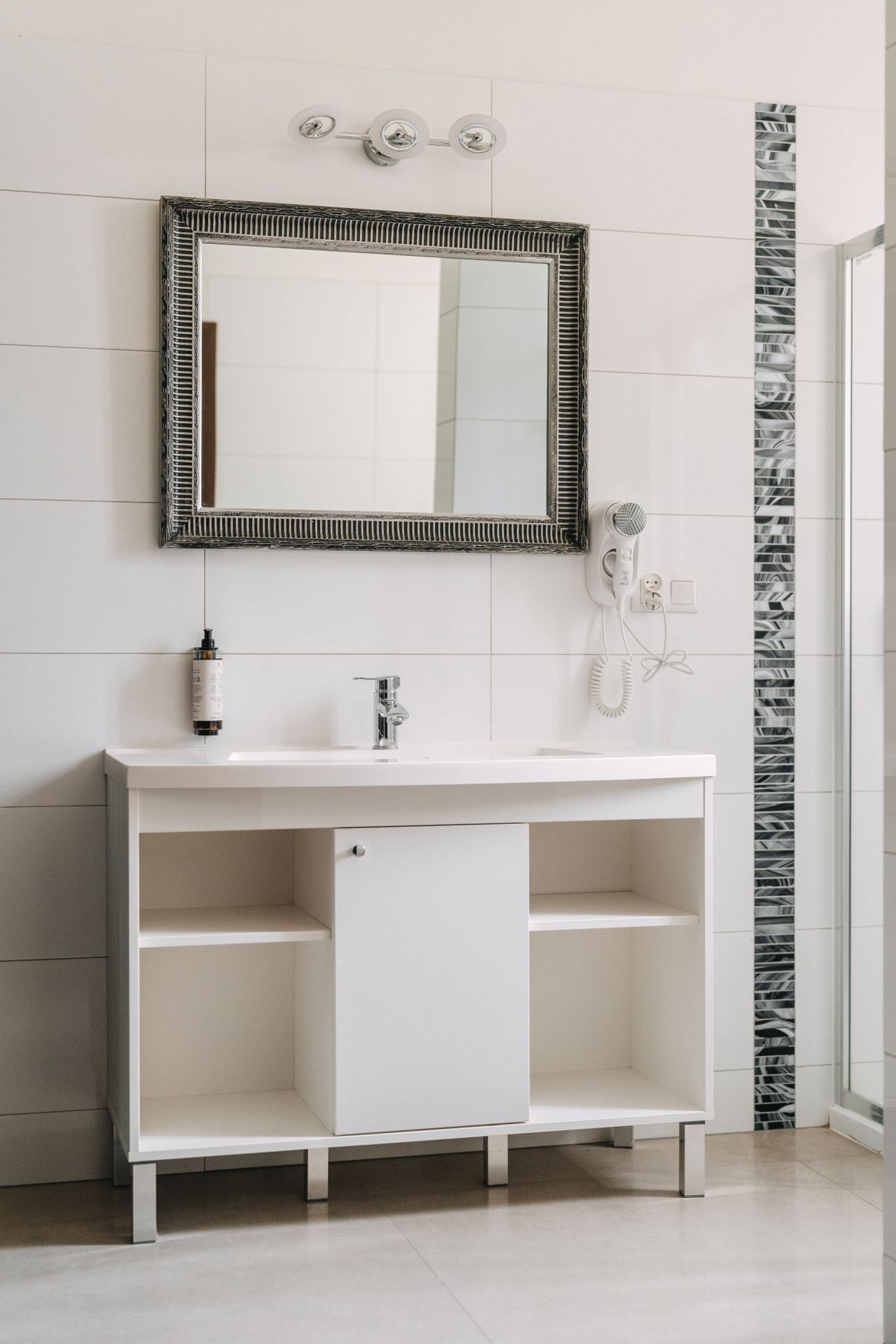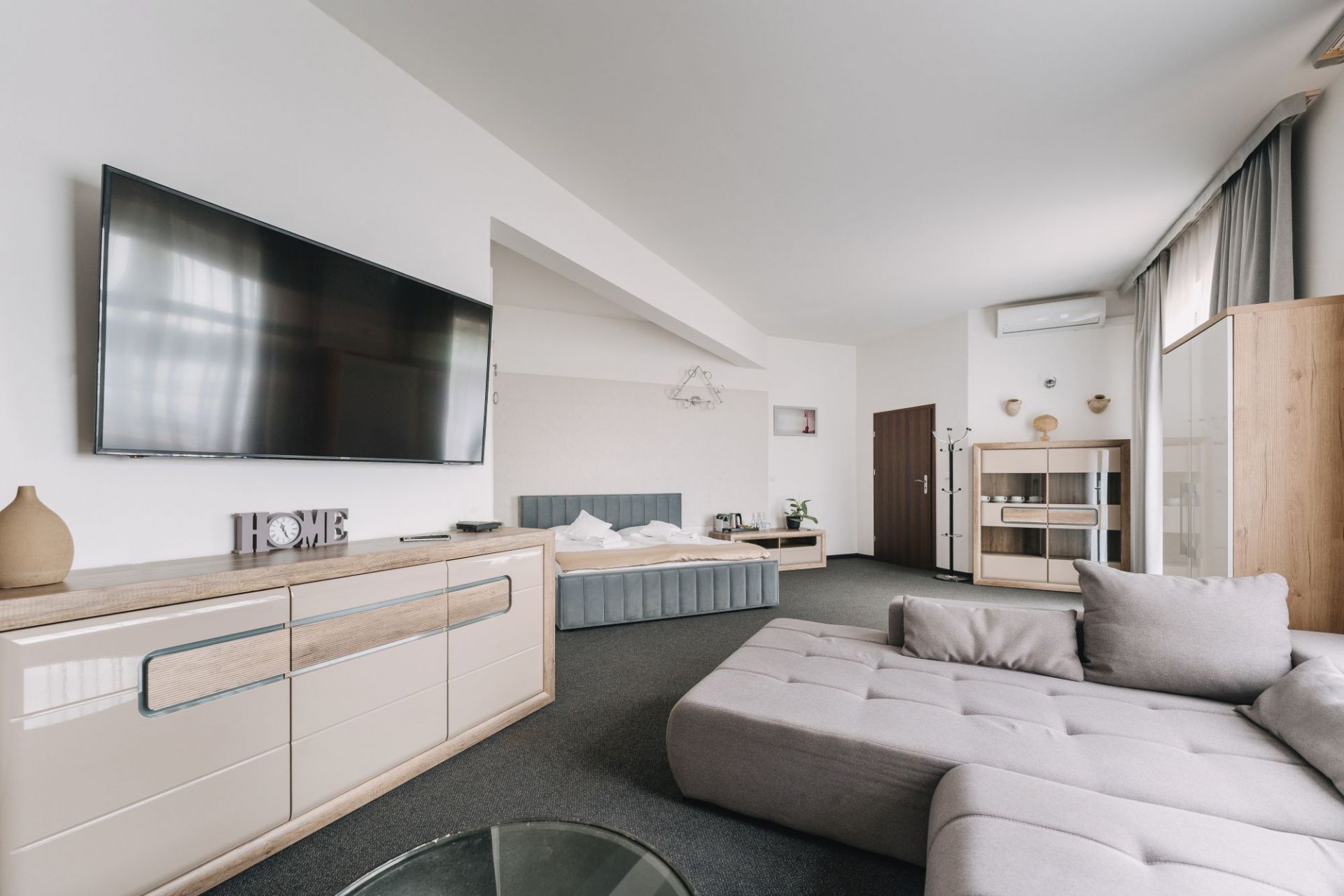 Luxury with a view that is memorable. A suite that impresses not only with its decor, but also with its space. It has a large living room with a panoramic view of the picturesque lake and nature, a separate bedroom with a double bed, a spacious bathroom equipped with a hairdryer, a beauty kit. The room has a desk/table , TV, Wi-Fi access, coffee maker.